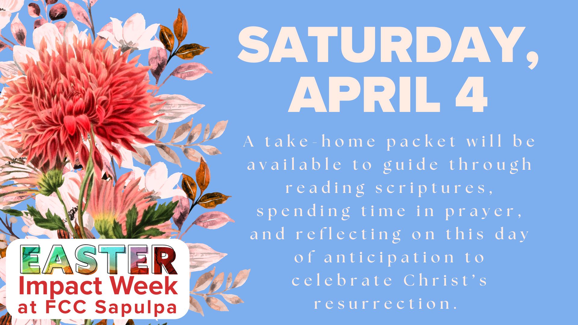 Saturday of Easter Impact Week + Add to Google Calendar + iCal / Outlook export Date Apr 04 2026 Expired! Time All Day Category Featured Events Share this event